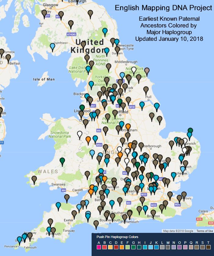 The English Mapping DNA Project now has over 820 participants. We have performed a review and geocoding of the earliest paternal ancestors listed for all participants with many new plots pointed. This effort gives us currently 504 ancestral positions plotted on the map page. A static image of this map with major Y-Haplogroups was published.