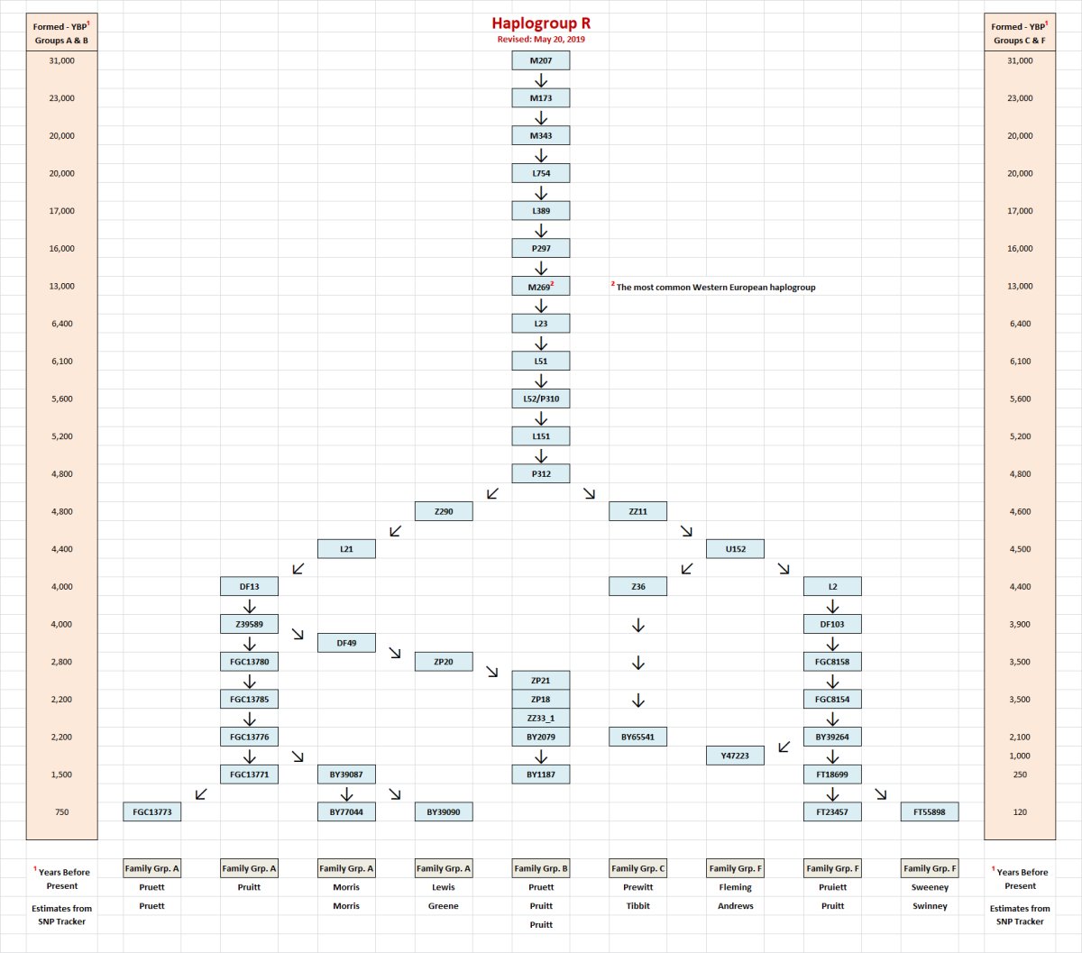 As a result of the Big Y, we can now provide a SNP (pronounced "snip") view of our family relationships (see the chart below - click on the chart to open up a larger version in your browser). [We could also call this a Haplogroup view; just put “R-“ in front of a SNP name and you have the name of the Haplogroup.] In the past our understandings of family relationships have come from STR testing through tests like the Y-DNA 111. STRs mutate more quickly than SNPs. For that reason and others, STRs are pretty useful in identifying relationships within the last 300 years or so. Based on this STR view of our family relationships, we've known for some time that our six Prew-it family groups likely are not related within the time period since the late Middle Ages when surnames became customary in Western countries. As shown in the chart below, Big Y test results have confirmed this. Each light blue block is a SNP or Haplogroup shared by one or more Prew-it family groups. Up until around 4,800 years ago, all of our Prew-its were in the line from M207 to P312 (along with most Western Europeans). At that point, the individuals whose descendants would later make up Family Groups A and B split off from Family Groups C and F. Family Groups A and B continued on a line to Z39589 where they split around 4,000 years ago. By contrast, Family Groups C and F continued on a line from P312 to U152 where they split around 4,500 years ago.