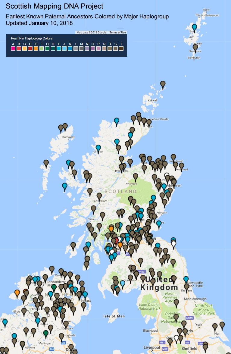 The Scottish Mapping DNA Project now has over 1,300 participants. We have performed a review and geocoding of the earliest paternal ancestors listed for all participants with many new plots pointed This gives us currently 768 ancestral positions plotted on the map page. A static image of this map was published.