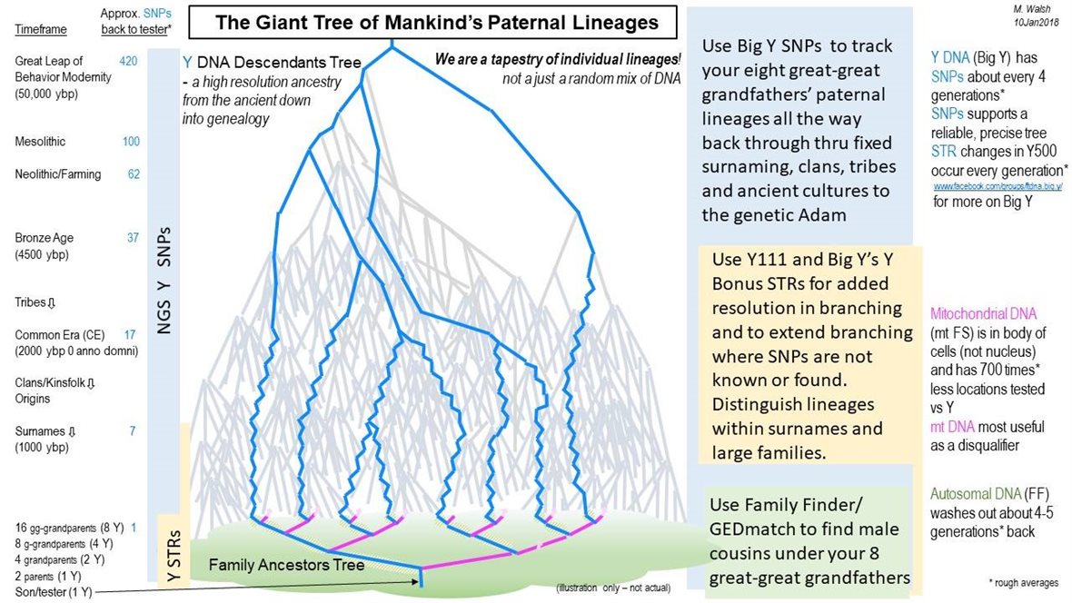 Autosomal DNA testing (Family Finder, AncestryDNA, 23andMe, MyHeritage) usually only gives you information about the first few generations of your ancestors. It is a great starting point. But if you are wanting to learn more about how you relate to different branches of your family going further back in time through DNA testing, yDNA testing will be the way to go, testing male relatives of your different ancestral lines. Y-DNA testing to 111 Y-DNA STR markers and BigY testing that provides SNPs and will soon be providing up to 500 Y-DNA STR markers will help surname projects in a genealogical time frame. The BigY DNA test can identify family SNPs that occur about every 4 generations, so applicable in the Strickland surname project. There is so much yet to learn about the Strickland family through yDNA testing. The chart of the "Y Giant Tree" below was created by Mike Walsh who granted permission to share on 1/8/2018. (Revised image, 1/10/2018) A larger copy of the tree image can currently be found at